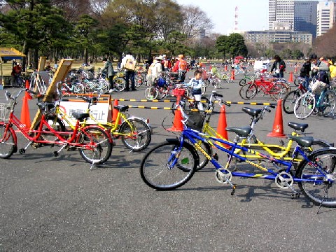 パレスサイクリングには、何台も走っています。デートにもおすすめと書きましたが、タンデム自転車も無料でレンタルしているのです。実際にカップルや親子が楽しそうに走っています。