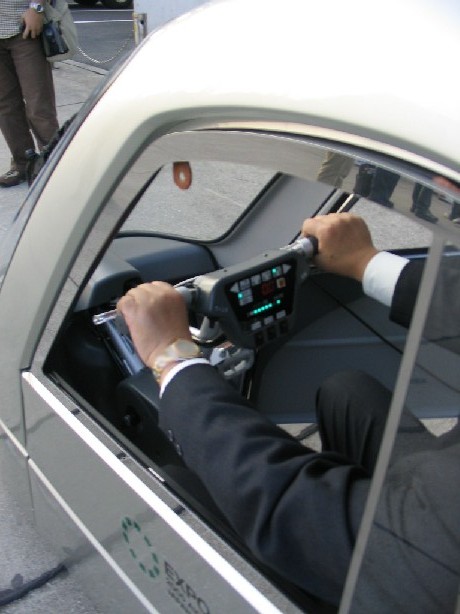 乗り込むと、かなり狭いです。周りを囲まれているので圧迫感があります。ハンドルの根元にはパネルがあって、速度などの表示が出るようになっています。まずクルマと同じように鍵をまわしてスイッチを入れなければなりません。小さなレバーがあって、片方は走行モード、片方は充電モードです。充電モードは、止まったままひたすら漕いで、充電させるのだそうです。