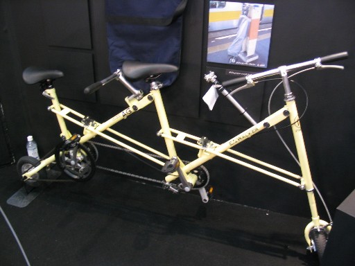 エクスウォーカーのブースには、なんと2人乗りのエクスウォーカーもありました。二人乗りは二人乗りでも、折りたたみの二人乗り自転車は聞いたことがありません。これはこれで画期的かもしれません。