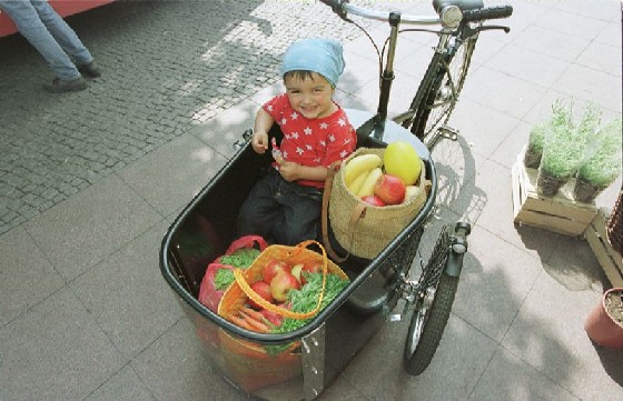 niholaという会社の3輪の輸送用自転車です。ヨーロッパに展開していますが、元々はやはりデンマーク系の会社のようです。前に大きな荷台があるのが特徴で、フードをつけたり、子供を乗せたりも出来ます。下の写真のようにシートをつけて大人が乗ることも出来ます。