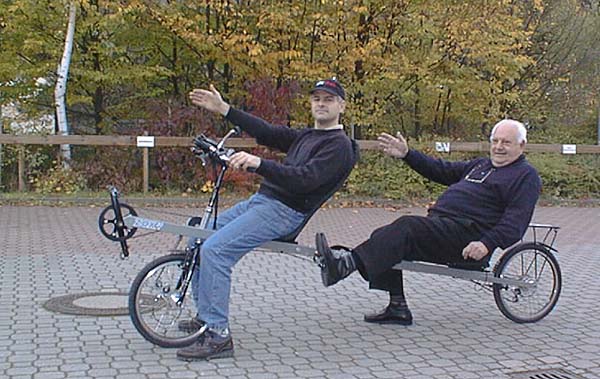 これまでも幾つか取り上げてきました。当然ながら、写真のようなリカンベントがベースになったタンデム自転車も存在します。しかし、この楽しそうなおじさん達2人が乗るタンデムバイク、単なる二人乗りのリカンベントではありません。