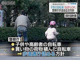 さらに、交通量が多く、車道通行が危険な場合にも、自転車の歩道通行を認める方針を決めた。 警察庁では、これらの改正案を盛り込んだ道交法を来年国会に提出する方針。(後略)