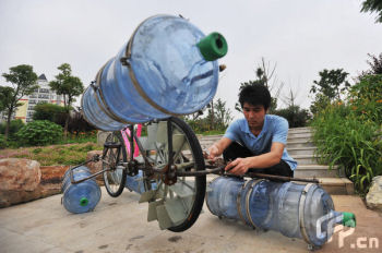 大きな8本の空のボトルによるフロートで浮力を得ます。陸上を走行する時は、このフロートをはね上げる形になります。後輪に推進力を得るための羽根がつけられており、なるほど単純明快です。ユニークな自転車ですが、となりを通る武漢の通行人の表情が微妙な感じがしないでもありません(笑)。