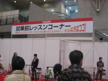 初心者に、試乗前のレッスンを行うコーナーも相変わらず盛況のようです。これからスポーツバイクを始めようという人が、毎年確実に来場しているということなのでしょう。いきなりでも乗れると思いますが、ハードルが高く感じている人も少なくないのだろうと思います。