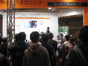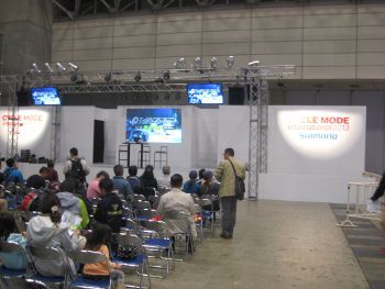 バーチャルなレースゲームなど、来場者参加のイベントも、そこここで行われています。展示ばかりでなく、各ブースでは、プロ選手のインタービューやトークショー、プレゼントがあたる抽選会など、それぞれ趣向をこらした催し物が行われていました。