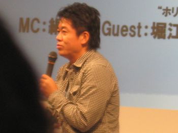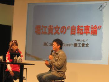 メインステージには、ホリエモンこと、堀江貴文氏もゲストとして登場していました。なんでホリエモンがと思った人も多いと思いますが、大学時代にはサイクリング部に所属し、今はトライアスロンに出場するなど、自転車好きなのだそうです。トークのテーマは、「堀江貴文の“自転車論”」です。