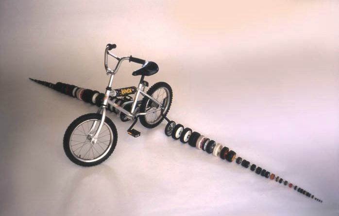 気持ちはわかるのですが、スポークが見えていて、タイヤが回転していないのがバレバレです。