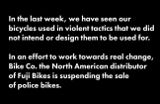 ところが、元は日本のブランドで、今はアメリカのメーカーである富士自転車、“Fuji Bikes”社が、自社の自転車のユーザーの使い方に対して文句をつけました。先週、自社の自転車が、抗議する市民たちに対し、自分たちの意図していない使われ方をされたのを見たからです。(↓ 下の動画参照。)